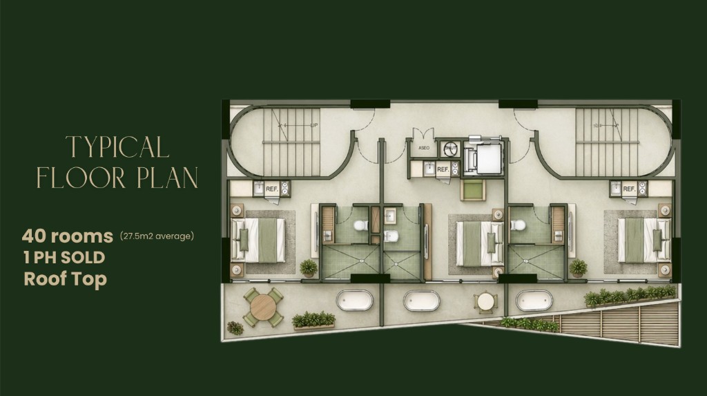 The penthouse (equal to 6 shares) has already been sold. There are 40 room shares available — 6 have already been sold.